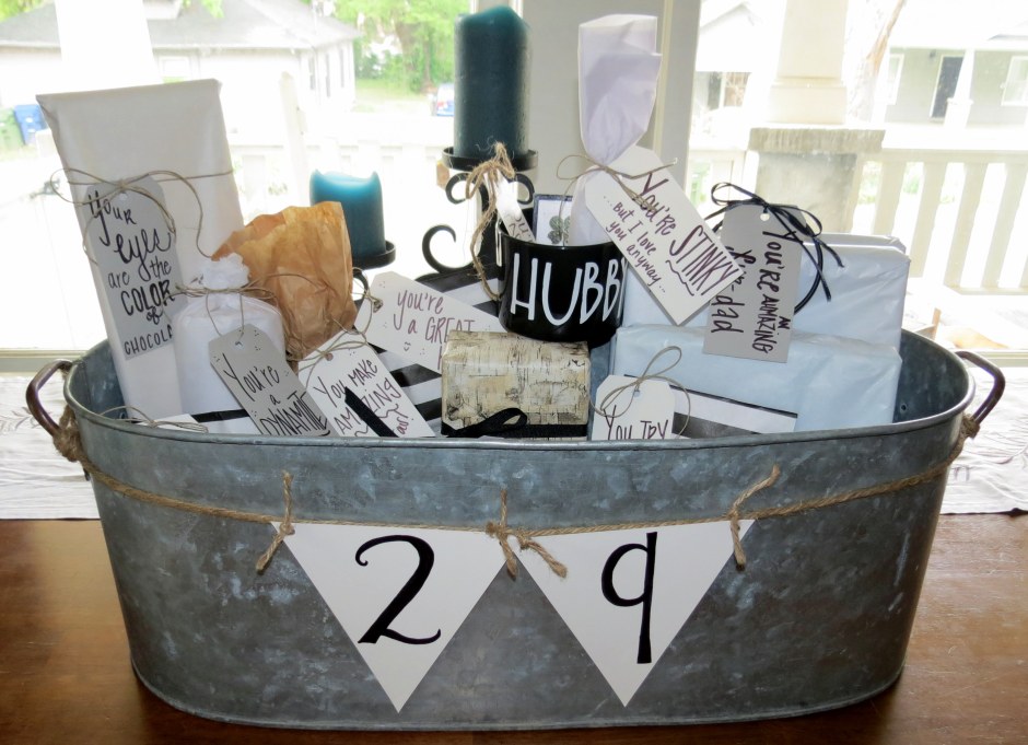 After a lot of Pinteresting (see my boards here) & a little bit of creativity, I came up with the “man version” of a gift basket, complete with little items that remind me of him. I started out with 10 items, but ended up with 14…fitting in perfect with his birth date of April 14th. Lastly, I wrapped each item in various paper, made tags showing which each gift represented, staggered all of them in a metal drink pale that we already had in the garage, & topped it off with a rustic banner made from cut out card stock & rope!